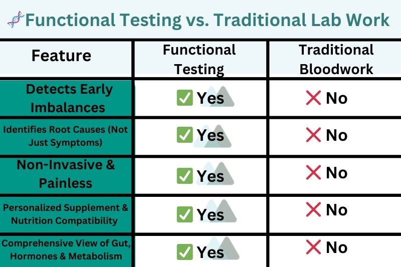 Traditional tests look for disease once it’s already present, while functional testing helps detect imbalances early, giving you the power to make changes before symptoms worsen.