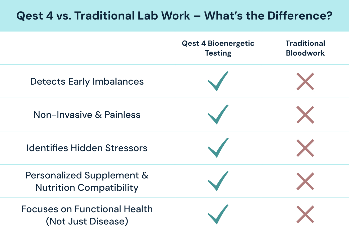 Traditional lab tests are essential for diagnosing disease, but they often miss underlying dysfunction. Qest 4 helps us see imbalances before they turn into long-term health issues, giving you a chance to correct course naturally.